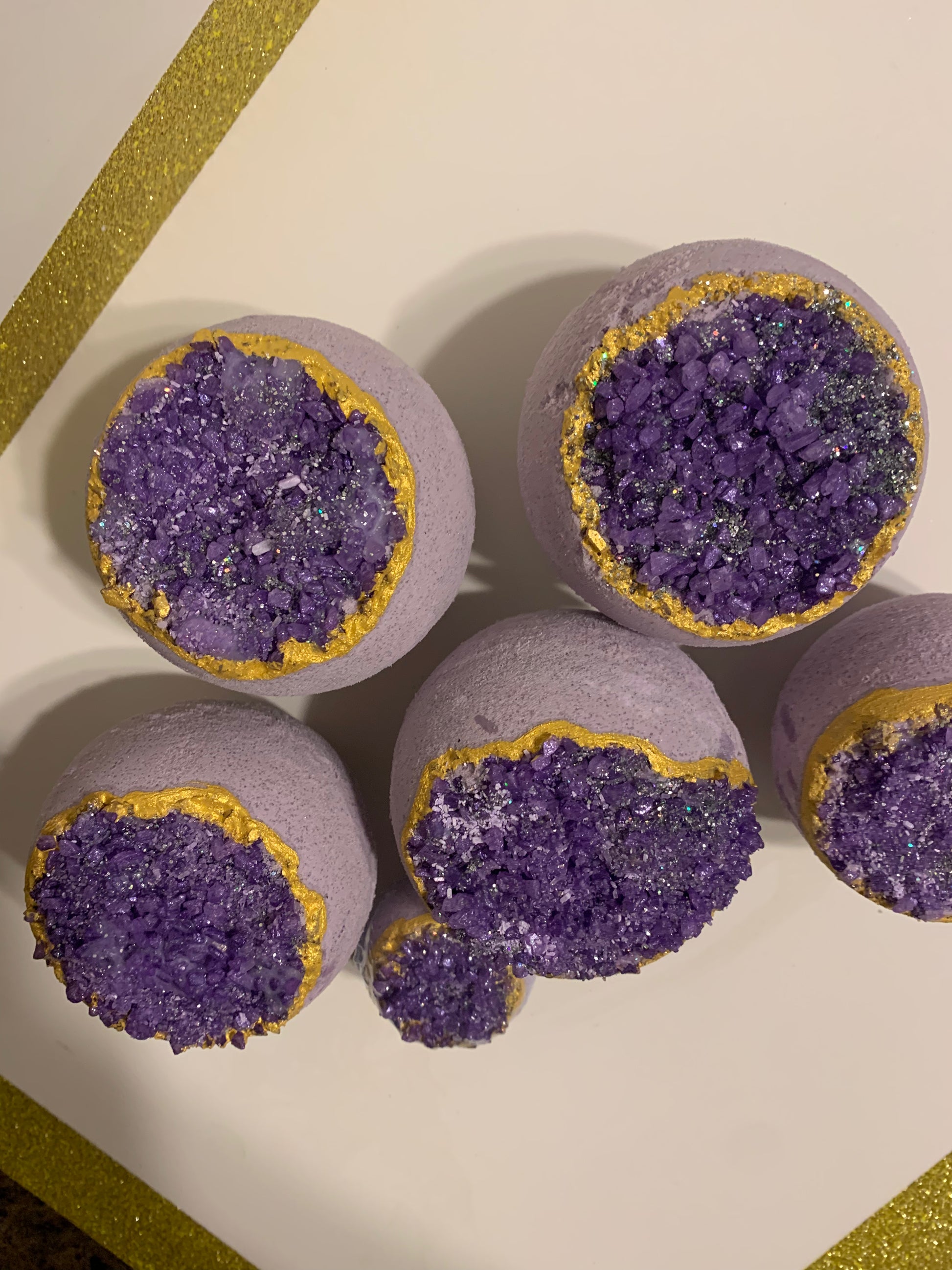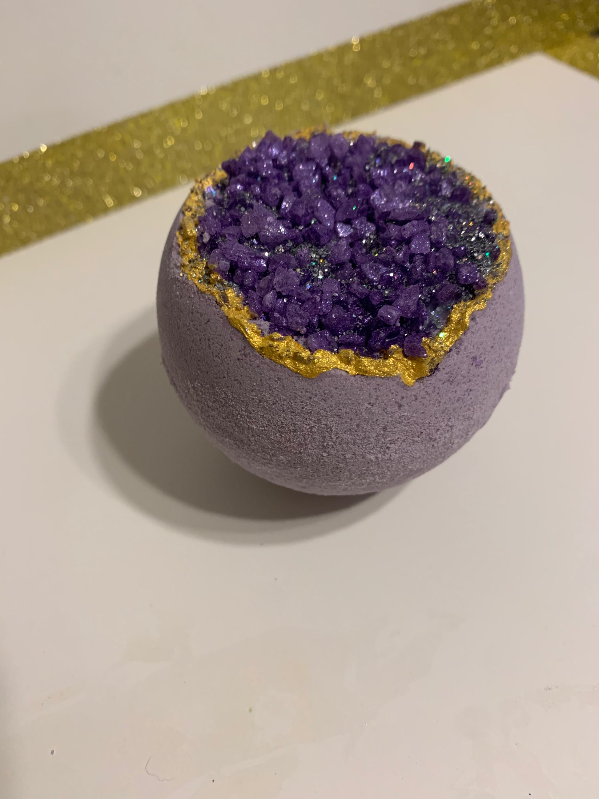 Beautiful Bath Geodes! Lavender, Bergamot, and Tonka Bean are an amazing trio of scent, this bomb not only smells amazing and relaxing, it is packed full of Epsom salts to soothe and relax sore muscles. A wonderful bath soaking experience! Lavender is a great relaxing essential oil to use before bed. Fizz, foam, bubble and soak your way into complete bliss for your senses and skin while relaxing and calming your mind and muscles.